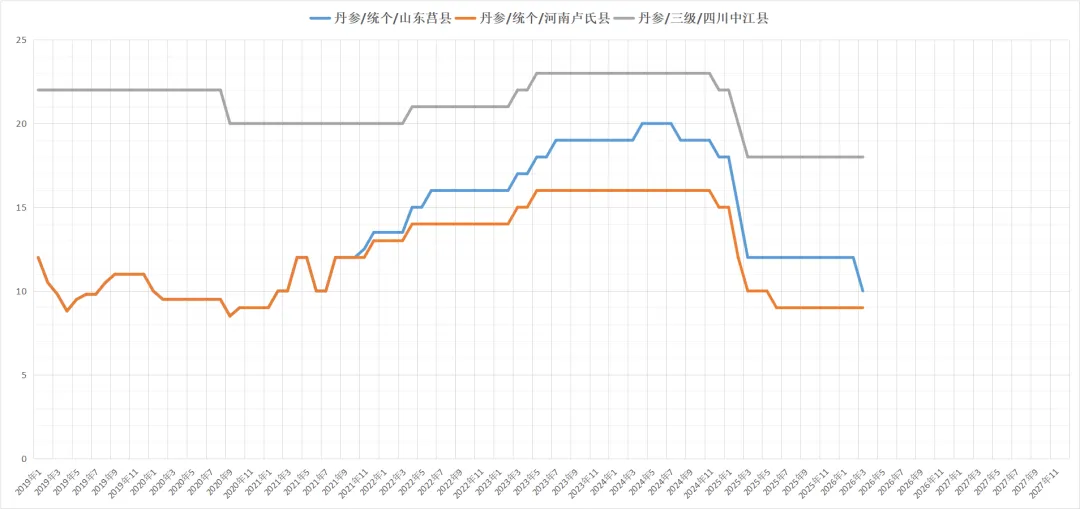 丹参产新进入扫尾期,受前期降雨天气影响,采挖受阻,新货小批量应市中,近期产地购货商家积极,货源走动加快,行情较前期略有上调,现鲜货收购价在3元,统货价格在10-13元之间。