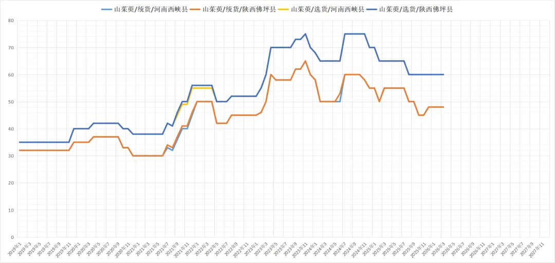山茱萸近期商家关注度较高,采购意愿积极,货源走动顺畅,行情基本保持稳定,现全检药厂货售价43元左右,一般饮片货价格在52-53元之间,筒子皮56-58元,电商货60-62元。