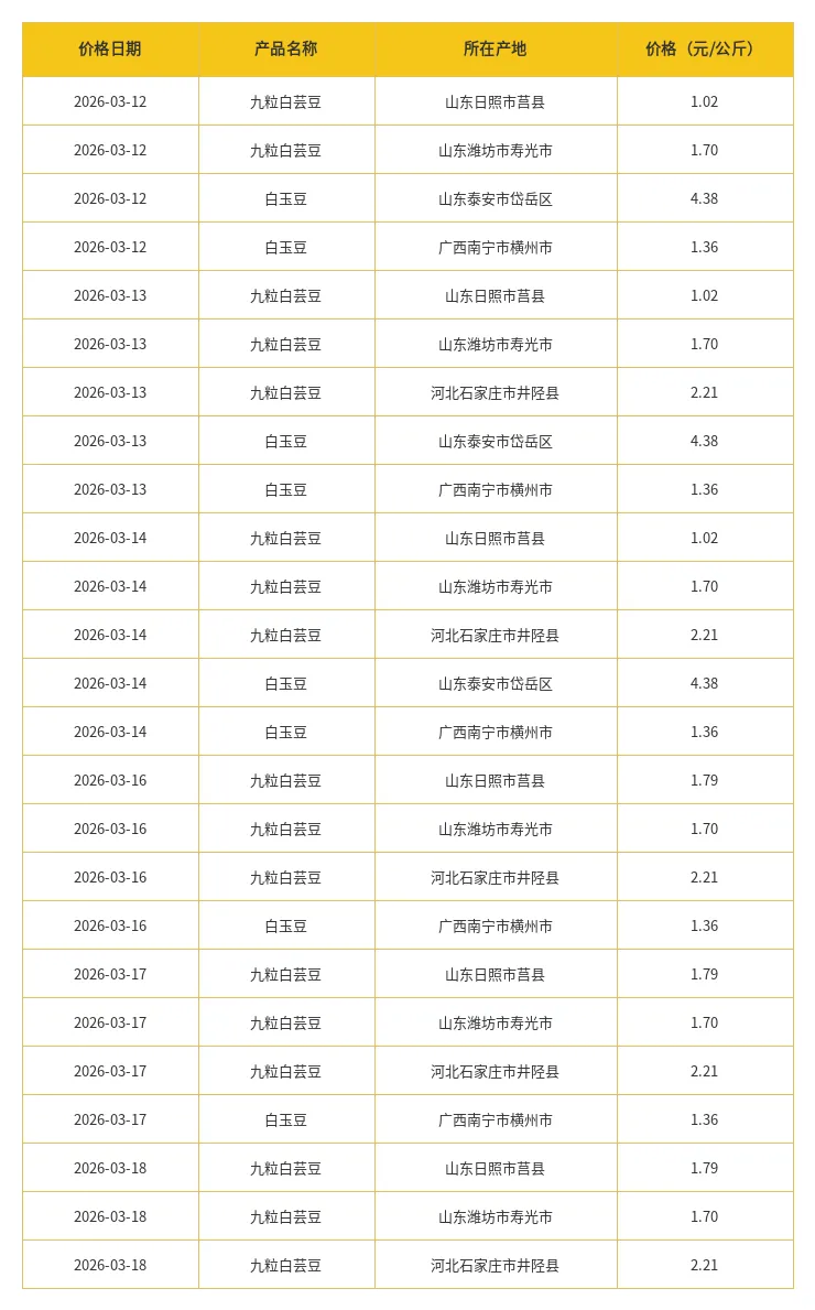 本周(3月12日--3月18日)豆科产品主要产地价格如下表: