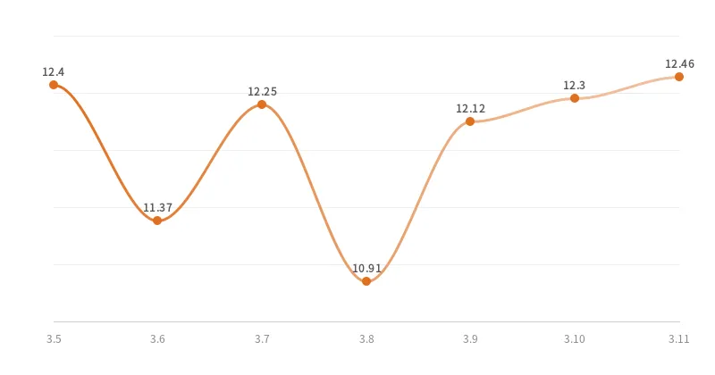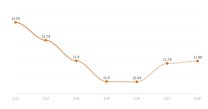 据农业农村部"全国农产品批发市场价格信息系统"监测,上周(3月5日--3月11日)芸豆(鲜食)全国市场价格走势如下图: