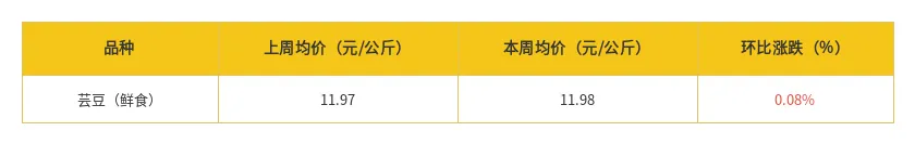 本周芸豆(鲜食)全国市场价格略有所上涨,上涨幅度0.08%