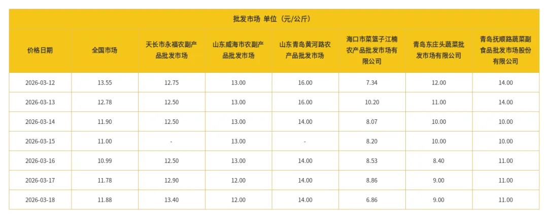 据农业农村部"全国农产品批发市场价格信息系统"监测,本周(3月12日--3月18日)芸豆(鲜食)全国市场价格走势如下图: