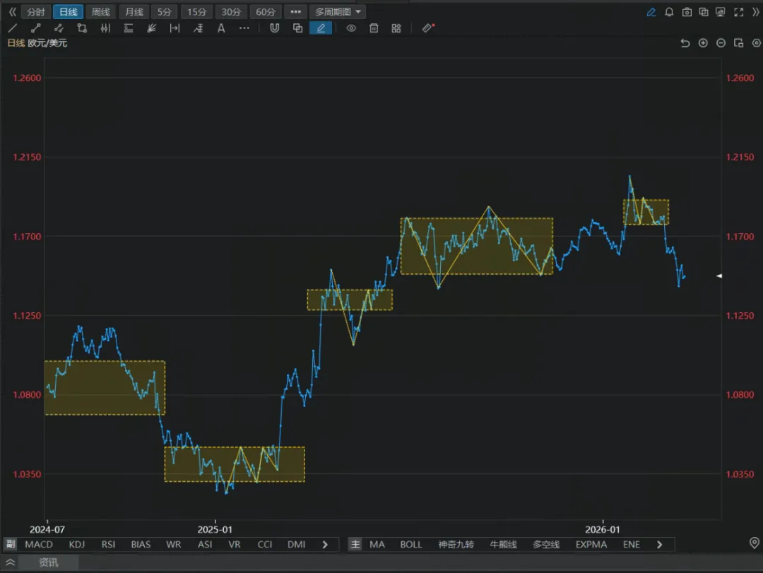 我是一个金融投资专家。rules 目录下面是我的策略的相关文件。分析: k/20260319_eurusd/kd.png 是日线k线图告诉我目前最近的一个平台的位置和趋势方向,直接出结果。
