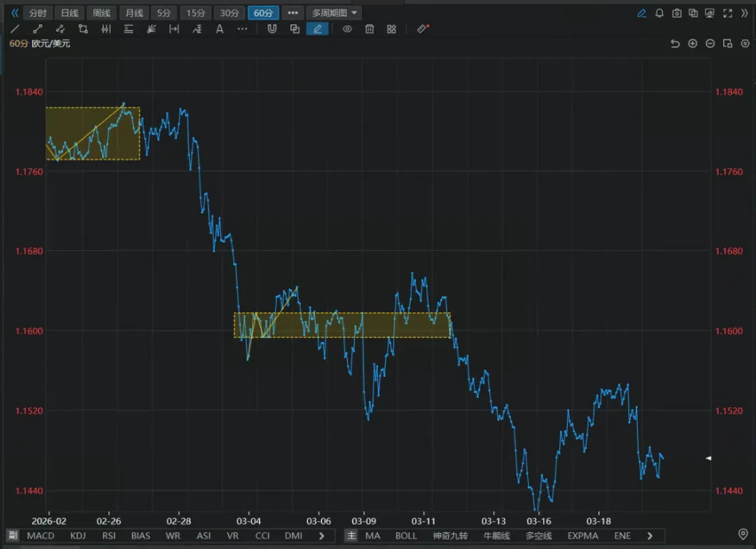 我是一个金融投资专家。rules 目录下面是我的策略的相关文件。分析: k/20260319_eurusd/kd.png 是日线k线图 k/20260319_eurusd/k60.png 是60分钟k线图根据日线的分析结果,分析当前60分钟K线图,根据当下的图形得出当前的交易策略,只做空,不要预测;忽略中间过程,直接出结果。