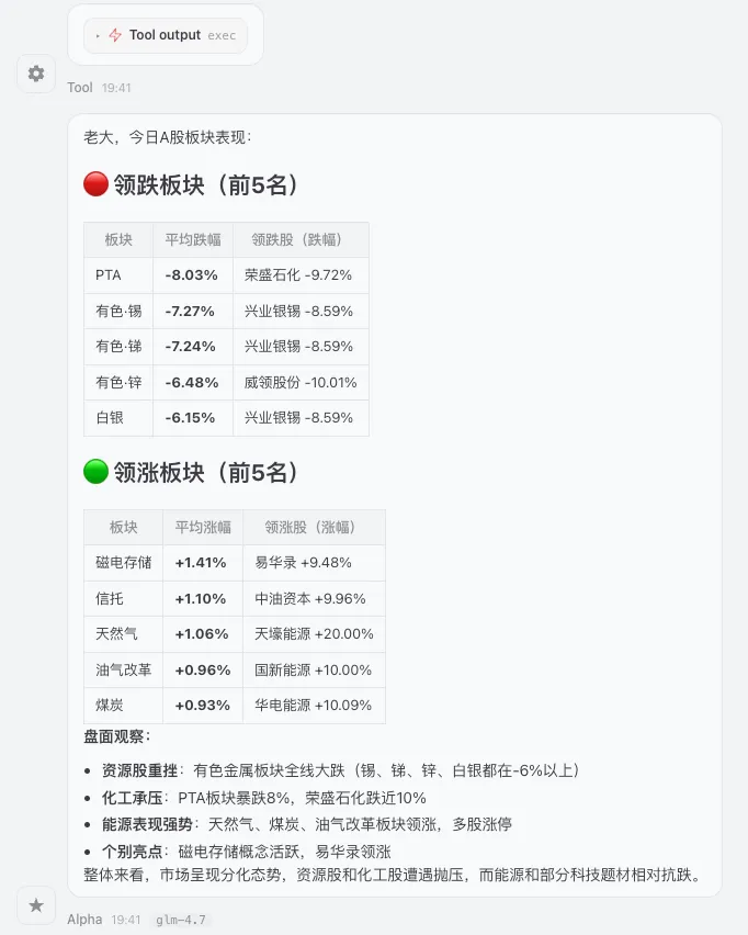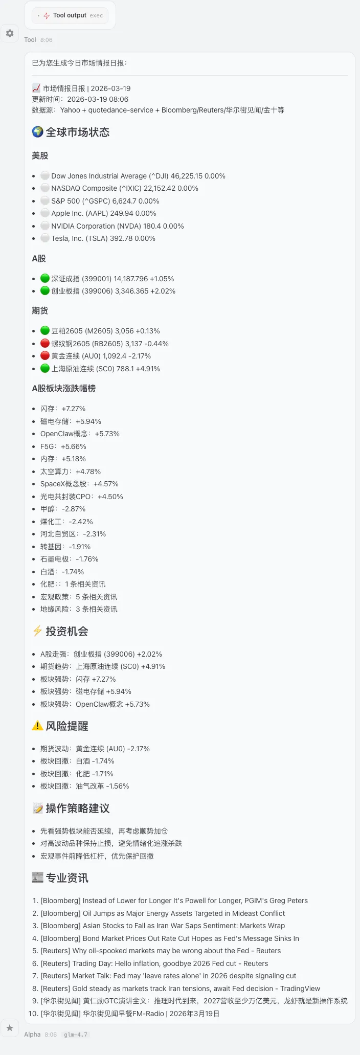 这是我每天最常用的部分。它把行情 + 板块 + 资讯整合成一份可读报告,并自动区分交易日/周末版本。