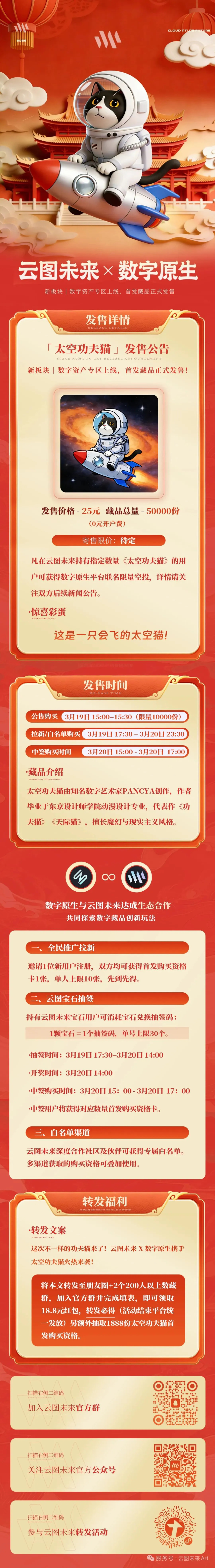 将本活动分享至您的朋友圈,并同步转发至2个200人以上的数字藏品交流群,加入官方社群并按要求填写登记表,即可领取18.8元现金红包,更有机会抽取「太空功夫猫」首发购买资格!