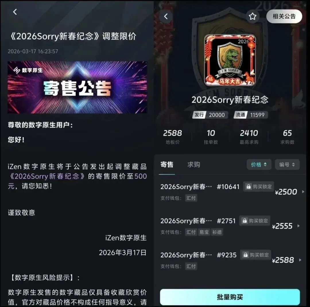 数字原生(izen)近期势头正猛!自3月9日与云图未来官宣联手后,其经典IP「Sorry勋章」价格直接起飞,从17日的500元地板价,在18日不限价活动中暴力拉升至2500+。这种老图翻几倍的行情,再次证明了IB系平台强大的控盘能力——只要平台想拉,就没有起不来的盘!