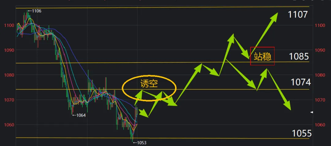另外上方1074这个位置是个小压力位,价格走到这个位置附近,主力有可能急跌进行诱空。