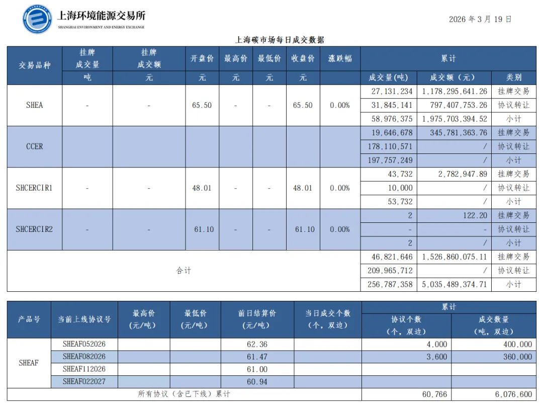 截至今日,上海碳市场所有现货品种累计成交量256,787,358吨,累计成交金额5,035,489,374.71元。其中,配额累计成交58,976,375吨,成交金额1,975,703,394.52元;CCER累计成交197,757,249吨;SHCERCIR1累计成交53,732吨;SHCERCIR2累计成交2吨。上海碳配额远期产品累计成交数量6,076,600吨。