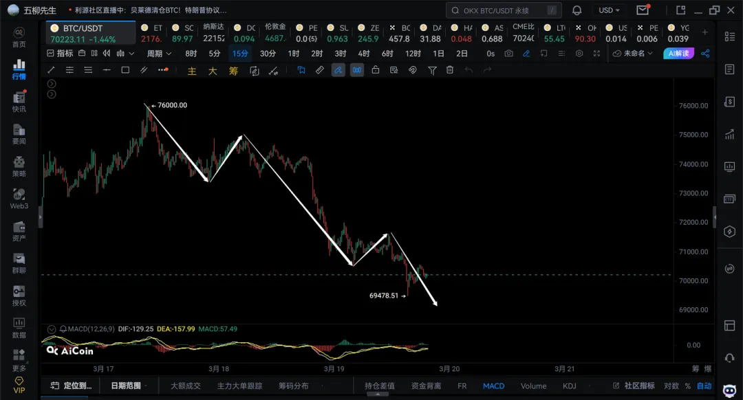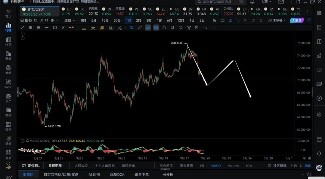 3)1h级别反弹走完以后,还会有第三笔1h级别的下跌,第三笔下跌目标先看到67500