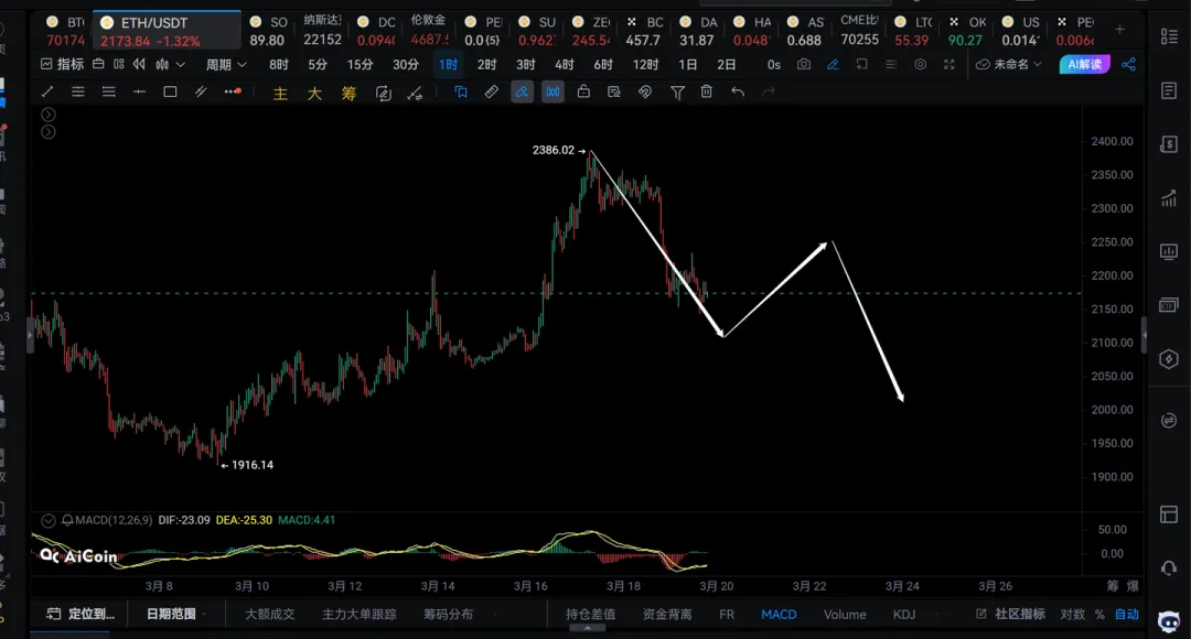 1) 以太由于跌破了2150,基本也可以认为当前在走一笔4h级别的下跌了