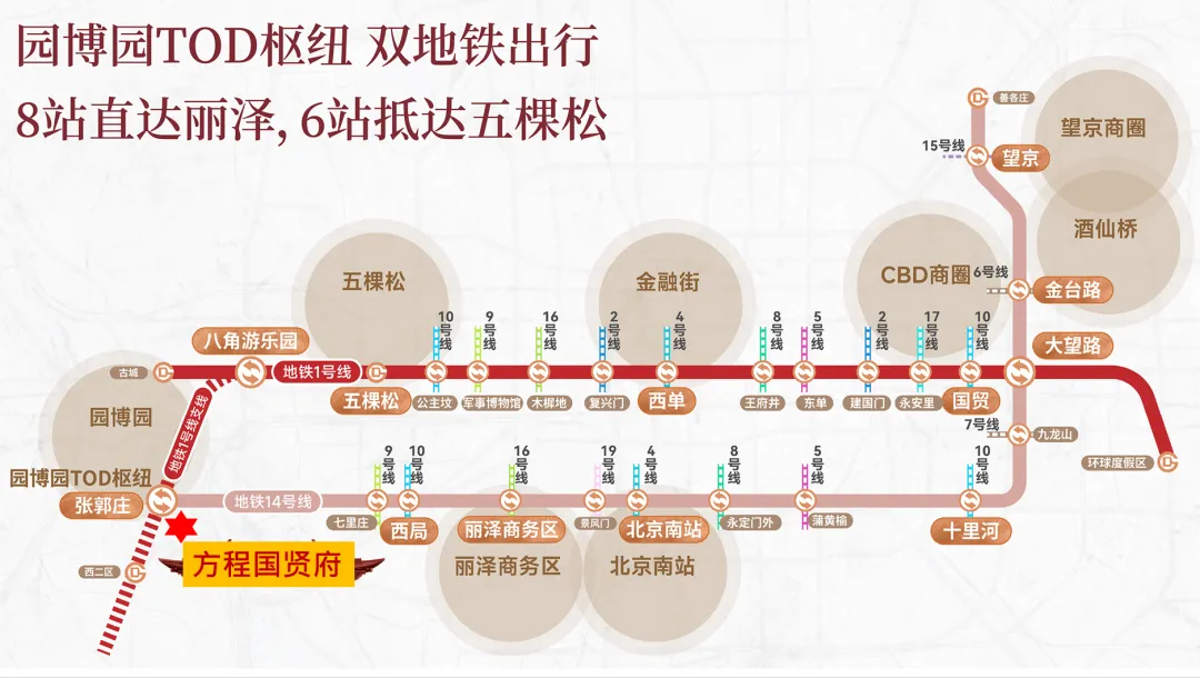 “双轨加持”的配置,在五环外的新兴板块中极为罕见,奠定了其TOD枢纽的城市地位。项目直线距离张郭庄站约300m,地铁1号线支线(计划2027年开通)贯通14号线、1号线后,8站直达丽泽商务区、6站速抵五棵松。