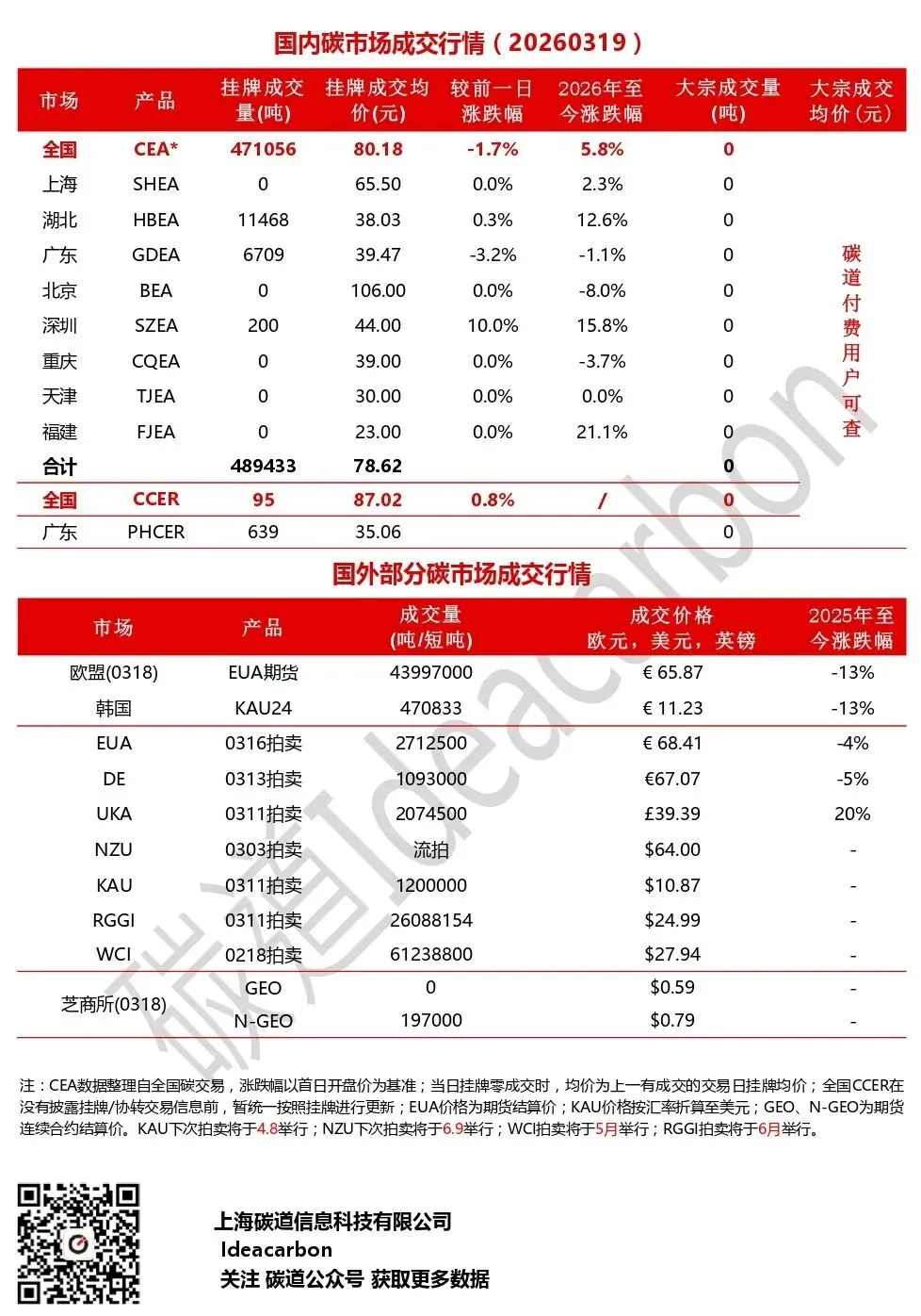 碳市行情26.3.19 | CEA挂牌成交47.1万吨,成交均价下跌...