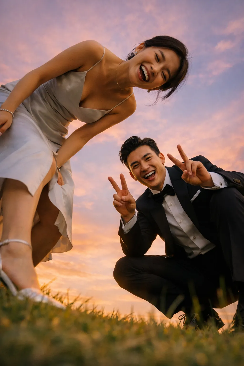 第一组我用的是超低角度仰拍。镜头贴着草地,用广角拉开空间感,让人物看起来更有张力。新娘弯腰从镜头上方笑着看下来,新郎在后面蹲着做了个搞怪动作,这一张画面特别有趣。
