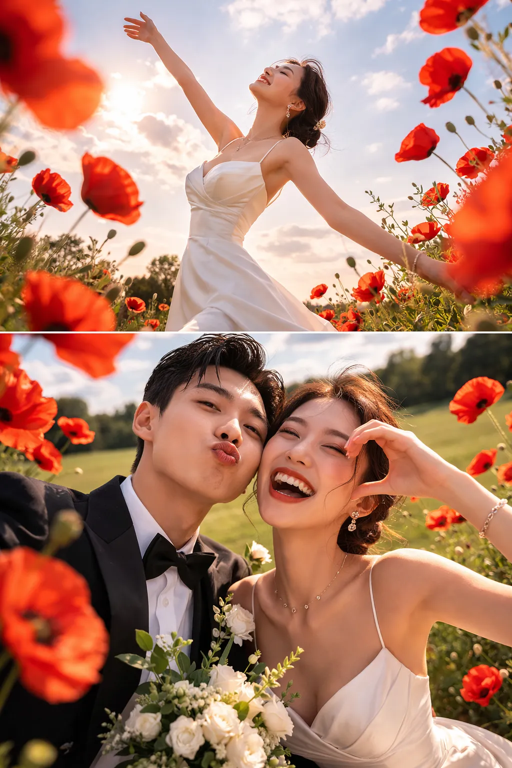 第二组照片我换了一个思路,用花做前景构图,让画面更有层次。新娘伸展手臂抬头,新郎在旁边搞怪,两个人互动特别自然。