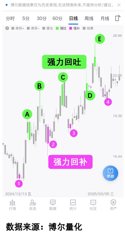 大家看下面这幅图,这是我用了十多年的量化大数据系统提供的交易行为轨迹图,其中玫红色数字对应的叫「强力回补」行为,顾名思义就是有资金开始重新买入,而绿色字母对应的叫「强力回吐」行为,就是指有资金开始兑现利润。强力二字代表了交易意愿非常强烈,要知道交易行为短期的波动非常厉害,只有这种力度达到一定程度的才值得我们关注。