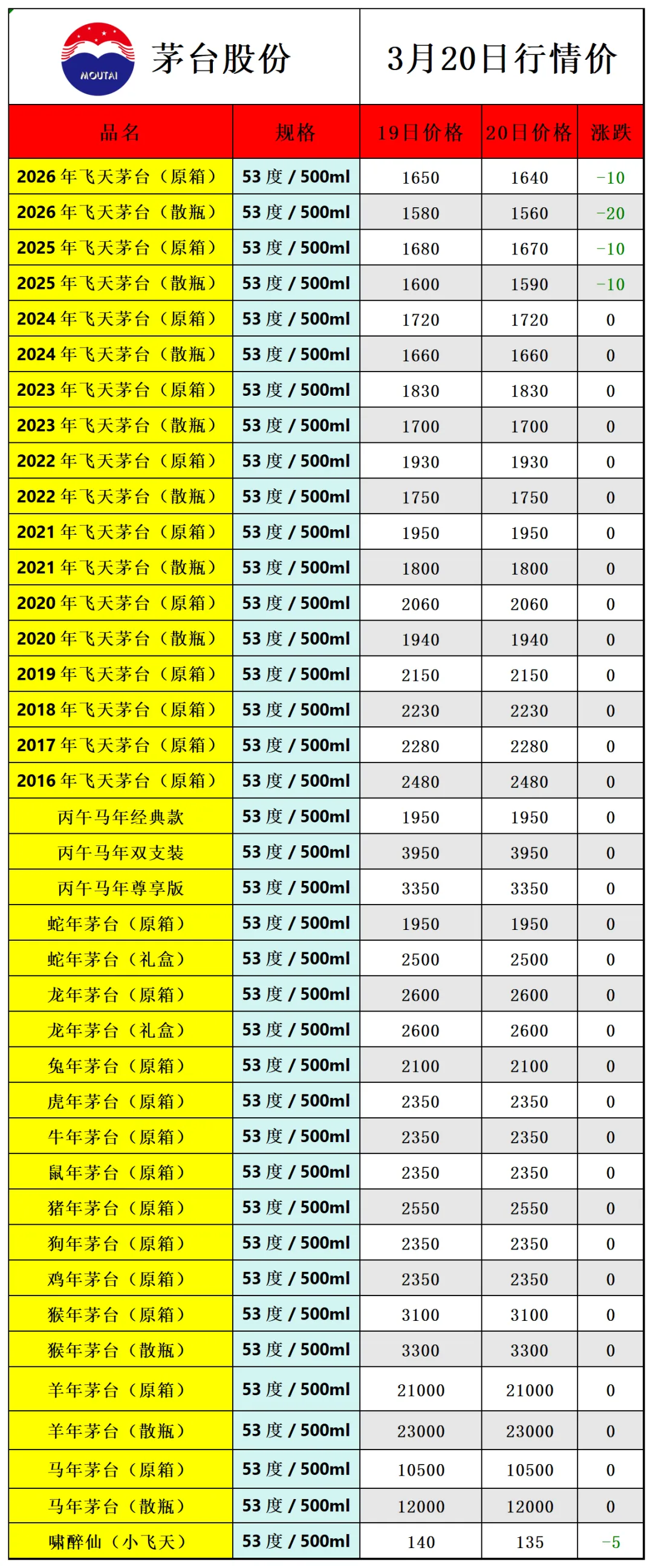 因各地行情有所不同,价格仅供参考!每天更新茅台价格,飞天茅台相关热点资讯,由于平台修改了推送规则,如若不想错过白酒市场行情报价参考, 请点击文章右下角的“在看”,推送会第一时间出现在订阅列表里,谢谢各位茅粉!