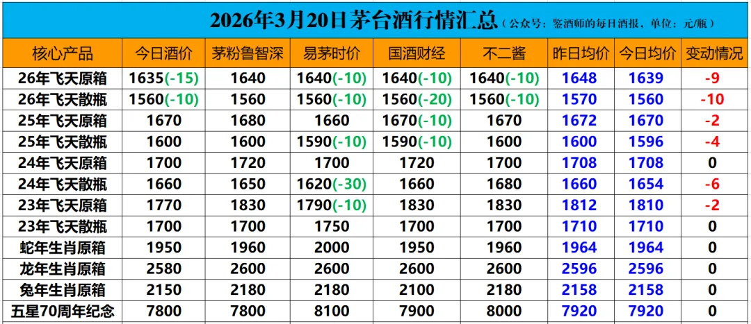生肖茅台:丙午马年经典款上涨2元至1936元;礼盒款均价维持在3938元;珍享版马茅保持在3363元。