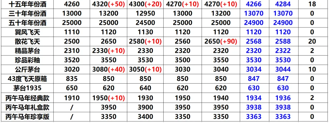 年份茅台:十五年年份酒上涨18元至4284元;三十年份茅台维持在13070元;五十年份酒保持在24900元价位。