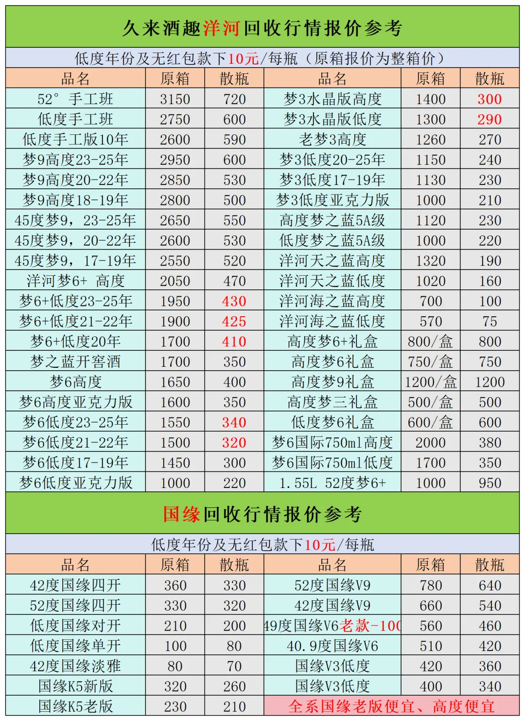 本公众号提供各种名酒回收行情报价,常规茅台、五粮液、洋河、剑南春、国缘等。所有报价根据市场买卖行情总结而来,每天更新最新报价!部分酒水每天涨跌幅较大,无法及时更新请谅解。本报价仅供参考,并非实际成交价格。感谢您的关注!我们会竭尽所能,提供更多更好的服务。