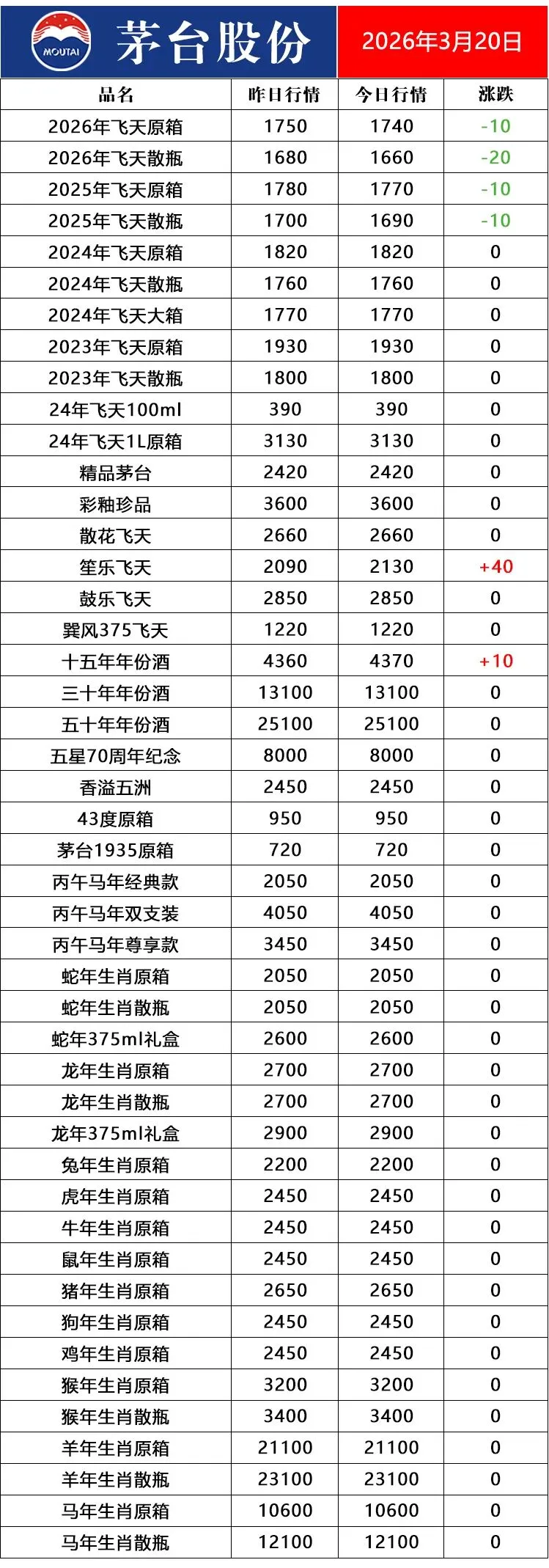 3月20日茅台名酒行情价!