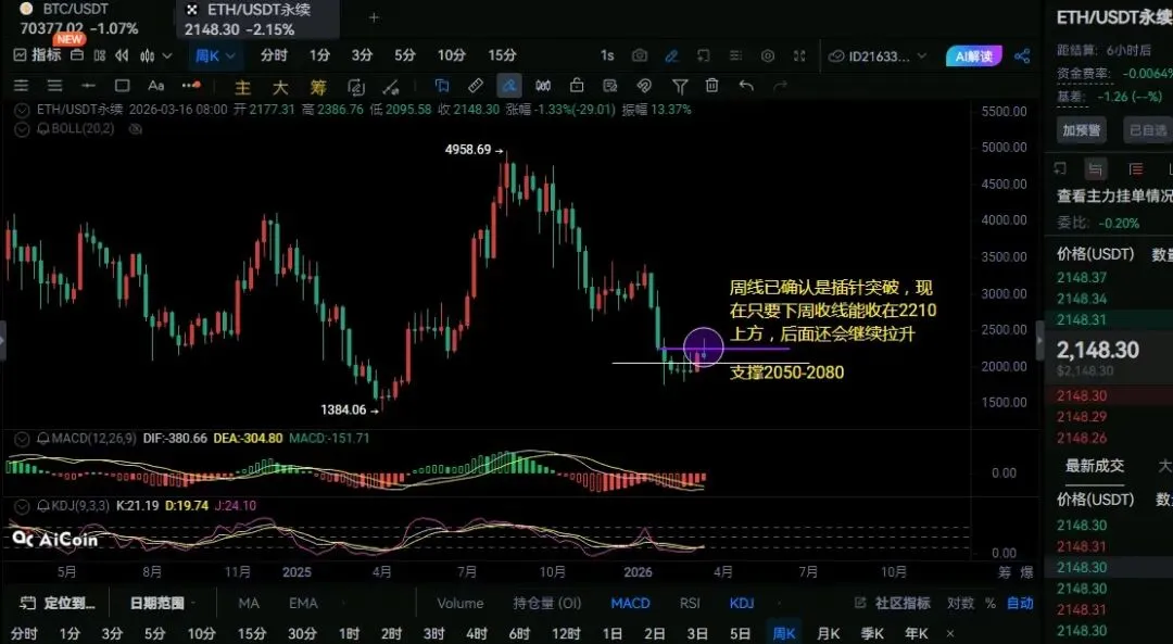 以太坊周线已确认为插针突破,2380-2435阻力,当前回踩至周线强支撑2050-2080 上方,属于突破后的蓄力阶段,2210下周趋势转变关键位,周线级别趋势空未被破坏;只要下周收线站稳 2210 上方,将确认大趋势反转,继续拉升;若跌破2050-2080则短期走弱。