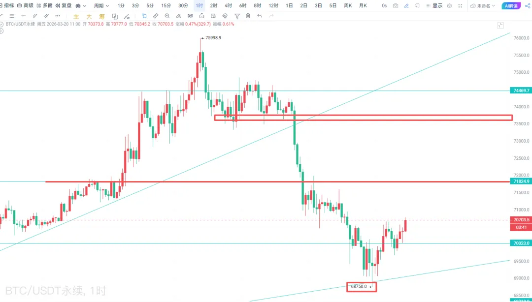 现在是2026.03.20周五的中午11:58分,BTC昨晚继续延续3月17日来的下跌行情,创出了68750短期低点后开始反弹,价格重新站上了70000整数关口,当前价格为70680,目前看短期上涨势能较弱,建议做空的朋友重点关注71888及73888两个位置。本周二布局的68588多单差170点没有进场,已取消挂单。