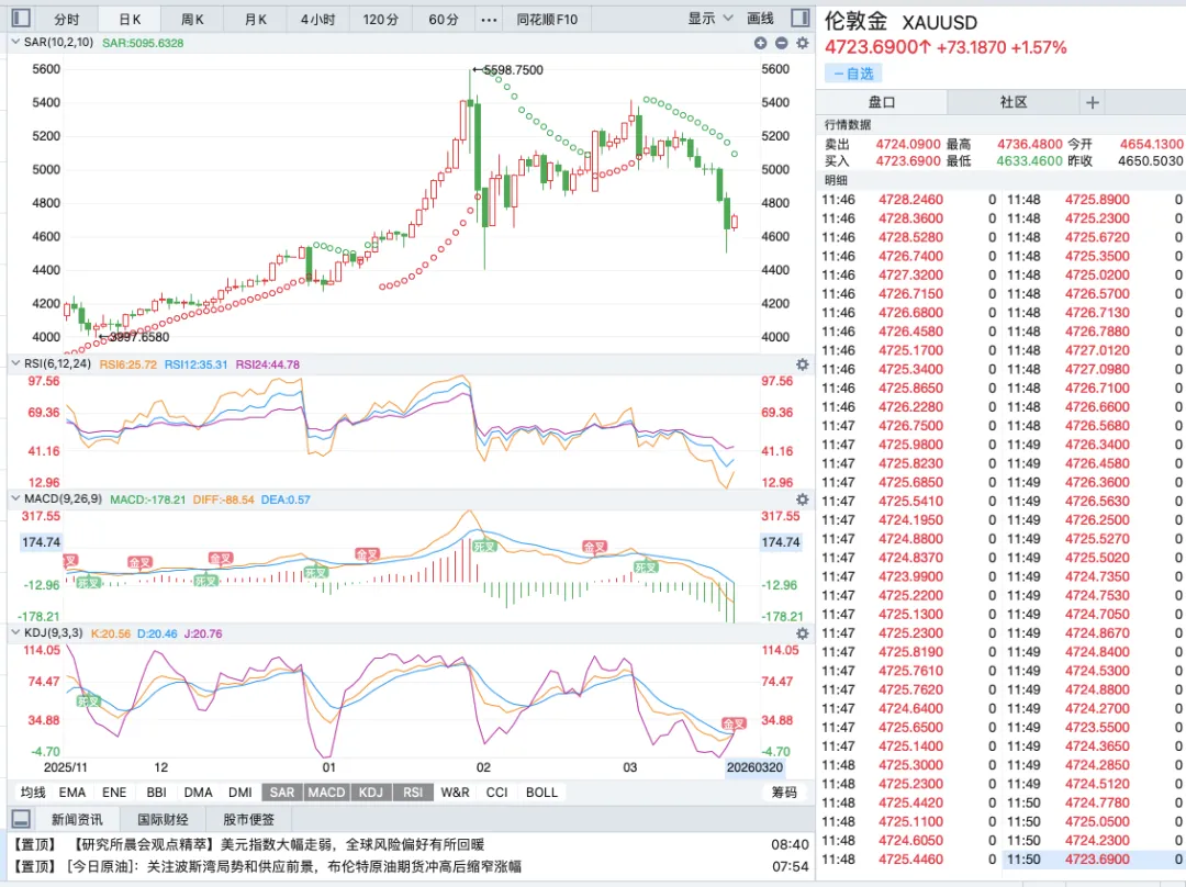 先给大家说一下今天的实时行情:周五开盘开在4650美元/盎司,和昨天的收盘价基本持平,开盘后先是小幅下探,最低触及到了4634美元/盎司的日内低位,随后企稳反弹,最高冲到了4735美元/盎司的日内高位,截至写稿时,价格在4732美元/盎司附近震荡,明显在选择方向。