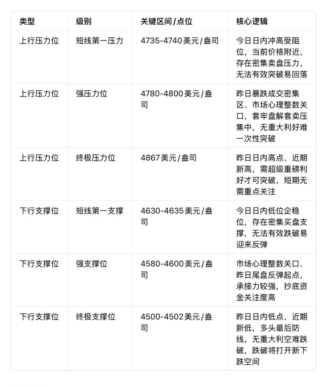 • 止损位:4585美元/盎司(放在强支撑位下方,避免被行情扫损)