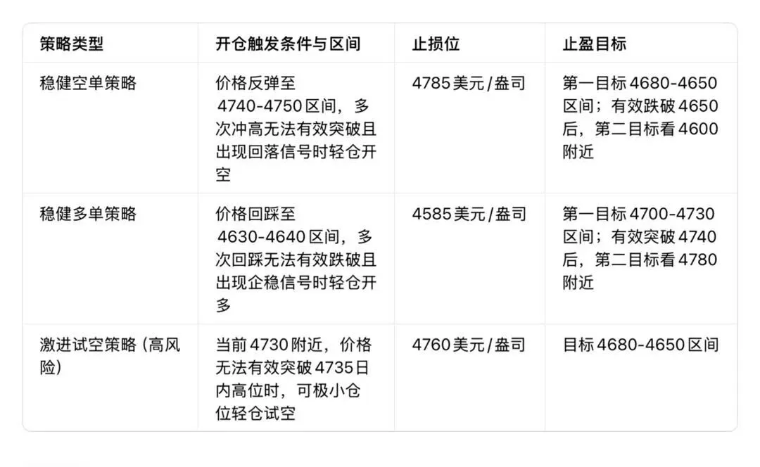 【特别提醒】:激进的朋友可以在当前4730附近,若无法突破4735轻仓试空,止损放在4760,止盈看4680-4650,但一定要注意,激进策略风险更高,务必轻仓操作!
