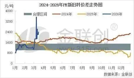 与此同时,新旧料价差的支撑也在发力。2月底美伊冲突升级,地缘风险推升国际油价单日涨幅超8%,迅速传导至聚酯产业链。新料价格随之震荡上行,新旧料价差显著拉大,再生材料的性价比优势重新凸显。以再生PE为例,3月份以来新旧料价格差距不断拓宽,截至3月19日二者平均价差已达2000元/吨以上,远超1000-1500元/吨的合理区间。在此背景下,再生PE加工利润已增至300元/吨以上,较前期明显改善。价差走阔为再生料的替代应用打开空间,下游采购意愿较前期有所回升。