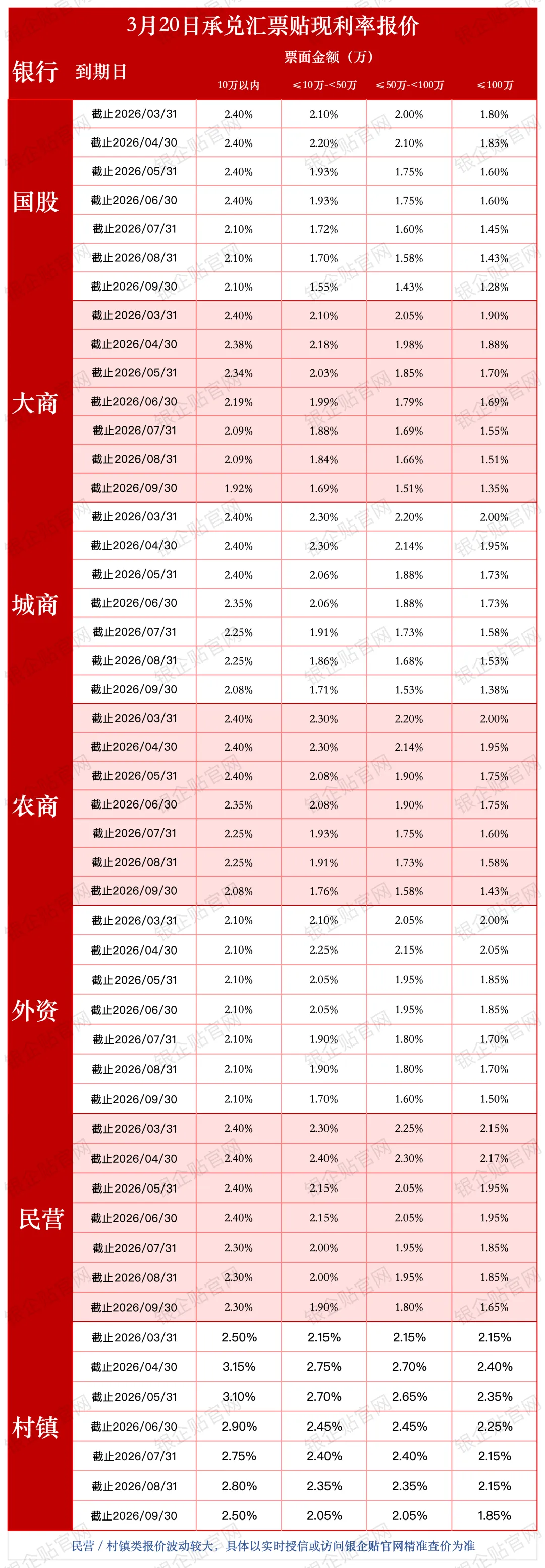 免责声明:以上利率为市场参考报价,实际以银行/平台实时授信为准,不构成投资建议。贴现业务请合规操作,风险自担。