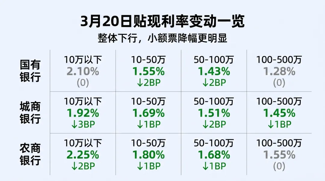 3月20日,承兑汇票贴现市场继续延续降息走势。最新报价显示,利率下行已从大额票向中小面额票据逐步传导,市场整体进入"稳中下移"通道。一、最新利率区间一览(半年期)
