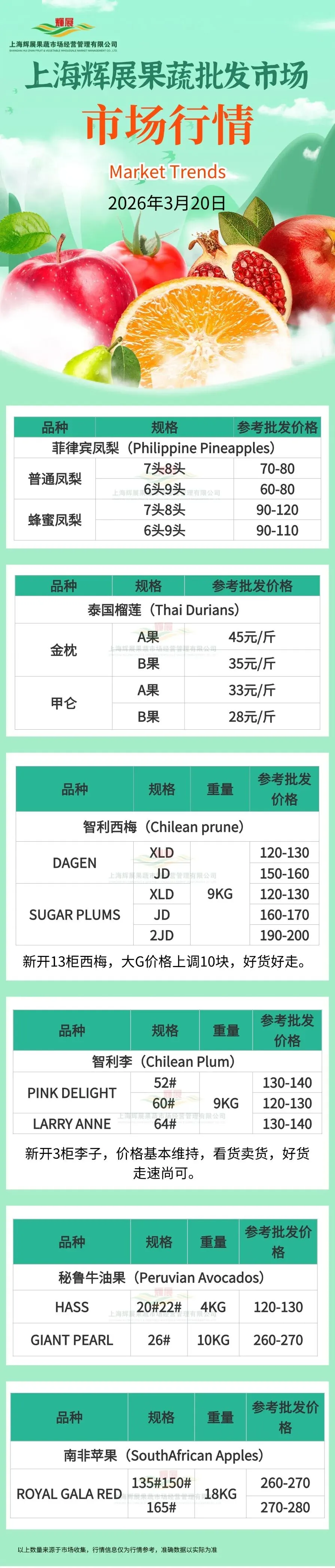 >3月20日上海辉展果蔬批发市场行情 |南非苹果、智利桃、智利李、秘鲁牛油果等