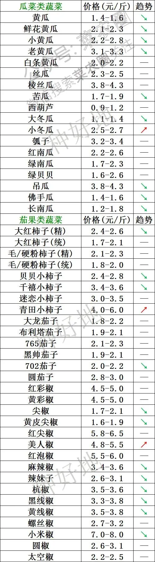 价格下跌的品种:茄果类的千禧樱桃番茄、大龙长茄;瓜菜类的黄瓜、苦瓜;椒类的尖椒、红尖椒。其中大龙长茄(-0.65元)、红尖椒(-0.60元)、小米辣(-0.50元)是跌幅较大的品种。干花黄瓜(即普通黄瓜)今日均价为1.40元/斤,最低价区间为1.0-1.8元/斤,印证了标题中黄瓜低价的情况。