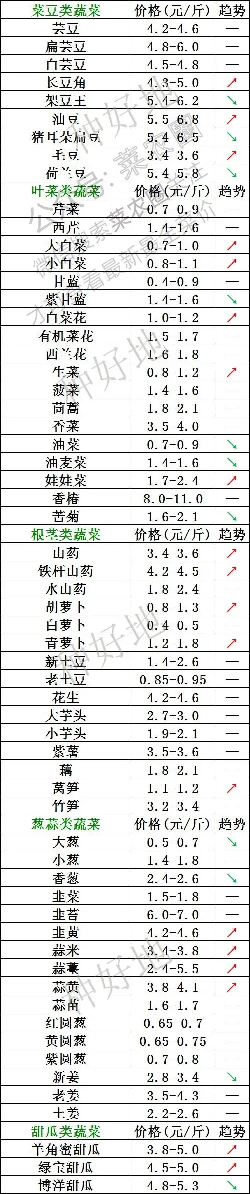 价格上涨的品种:葱姜蒜类的新姜、老姜价格上涨,新姜(+0.55元)和老姜(+0.30元)涨幅最为明显。此外,贝贝南瓜、圆椒、陇椒、荷兰豆、架豆王、土豆(新) 等品种价格也有小幅上涨。
