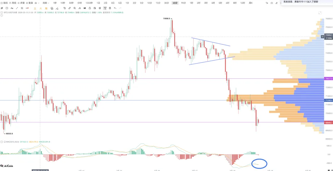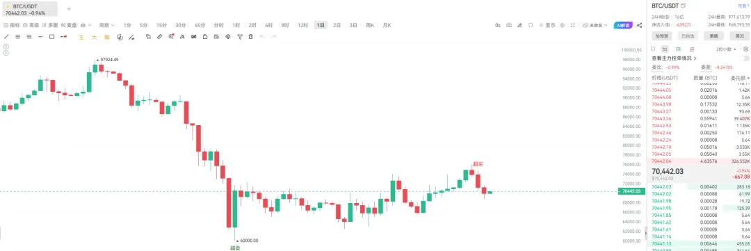 整体来看:69000-68500这个区域支撑有效,日线级别还是多头结构,但由于反弹无量,短期直接V转的难度较大,大概率还会在70000上下区间震荡。