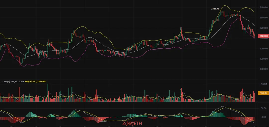 ETH 2小时从近期高点暴跌至2112,精准测试布林下轨2090,现反弹至2112短期形成V型底雏形,若守住2090,反弹概率极大!