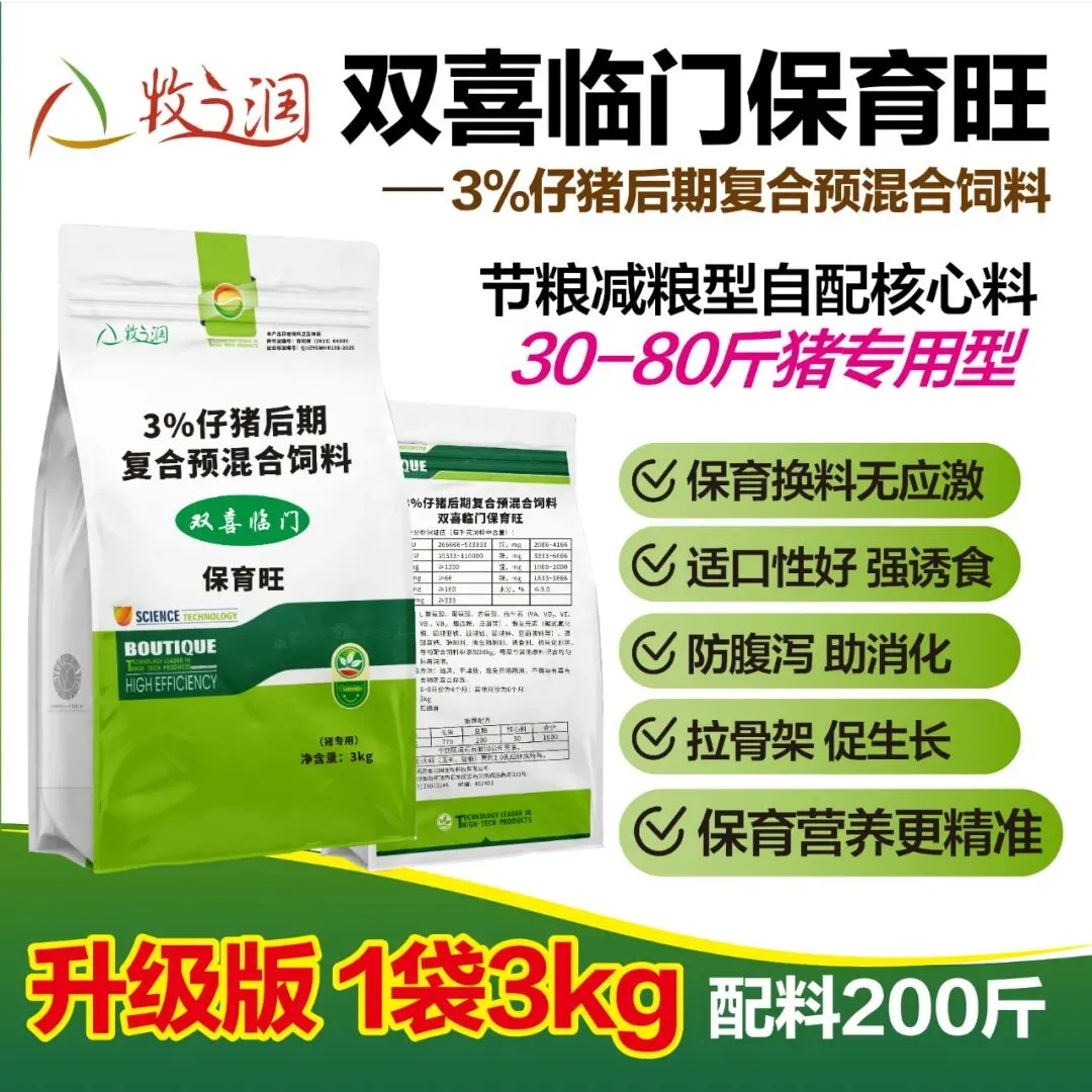 给您推荐一款双喜临门保育旺核心料,完全代替预混料,添加防拉稀核心成分,强化肠道避免换料引起的拉稀腹泻。保育料推荐:保育猪断奶至80斤专用核心料,帮你低成本轻松养好保育猪!精准更丰富的营养+能让骨架拉伸+肠道菌群平衡+肠道能更好的吸收营养。
