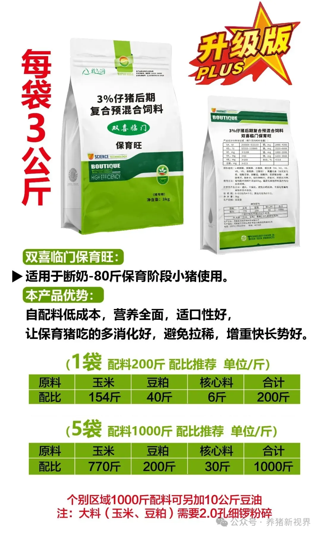 这款3%的保育旺款料是专门断奶至80斤保育阶段用的根据小猪营养需求专业定制营养水平更高,另外磷酸氢钙加对小猪骨骼生长发育是不可缺少了。1袋拌料200斤 够2~3头小猪从断奶到80斤使用