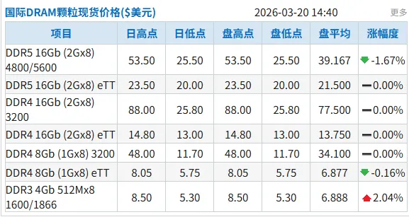 今日国际DRAM颗粒现货价格上涨部分仍集中在DDR3颗粒,DDR4和DDR5部分颗粒下跌。具体来看,DDR5 16Gb (2Gx8) 4800/5600下跌1.67%,均价39.167美元;DDR3 4Gb 512Mx8 1600/1866上涨2.04%,均价6.888美元。