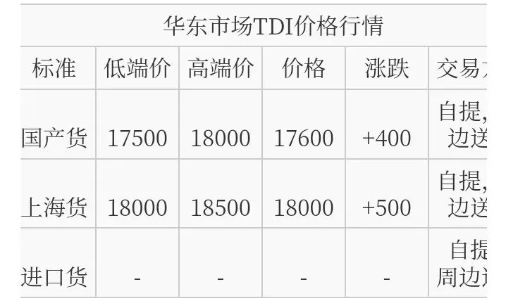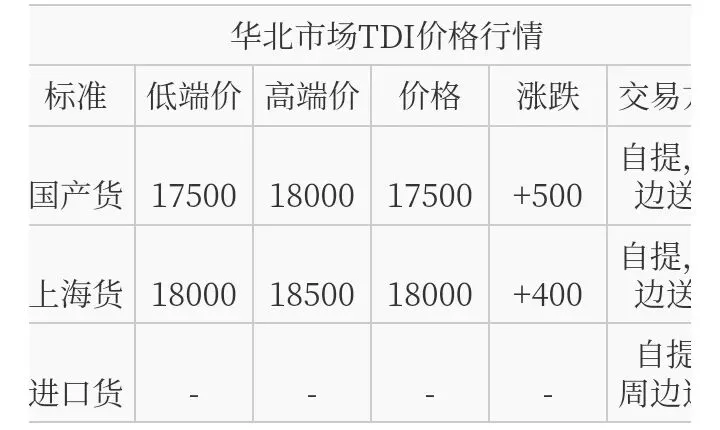 华北TDI国产货报盘价格在17500-18000元/吨,上海货报盘价格在18000-18500元/吨。
