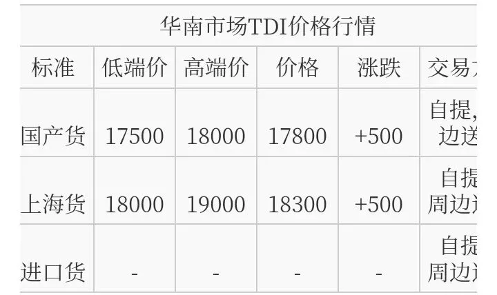 华南TDI国产货报盘价格在17500-18000元/吨,上海货报盘价格在18000-19000元/吨,报盘宽泛。