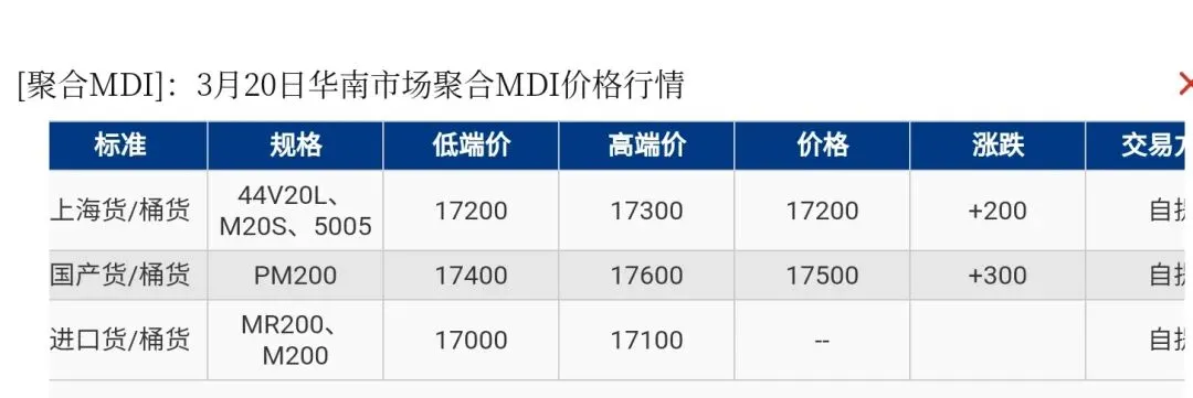 【市场动态】华南区域聚合MDI上海货报盘17200-17300元/吨,国产货源(PM200)报盘17400-17600元/吨,进口货报盘17000-17100元/吨。