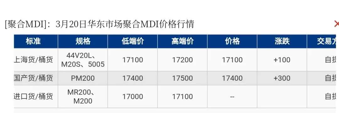 【市场动态】华东区域聚合MDI上海货报盘17100-17200元/吨,国产货源(PM200)报盘17400-17500元/吨,进口货报盘17000-17100元/吨。