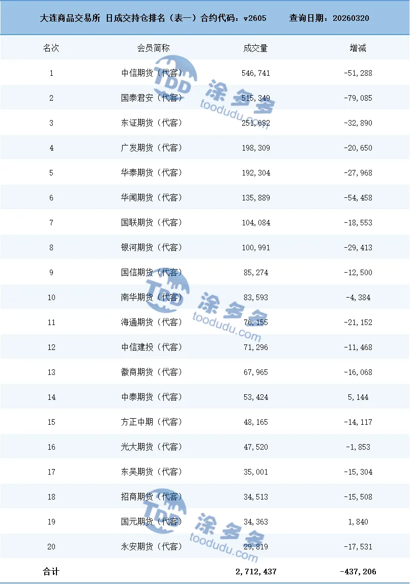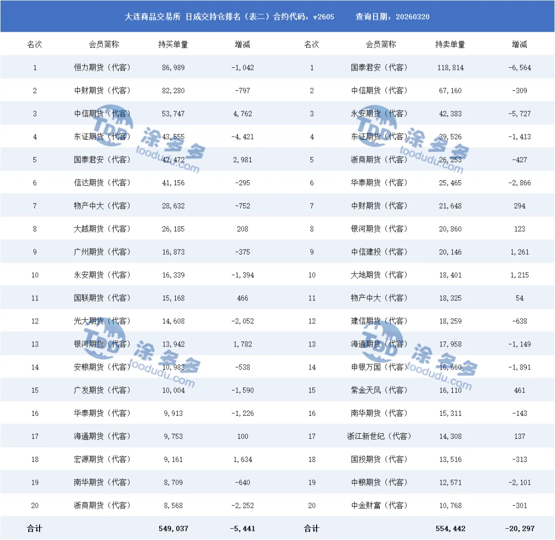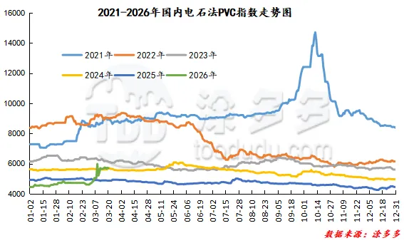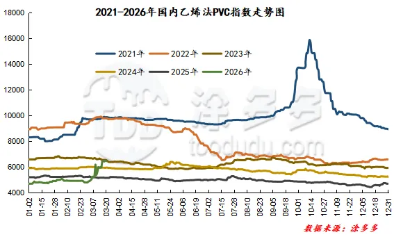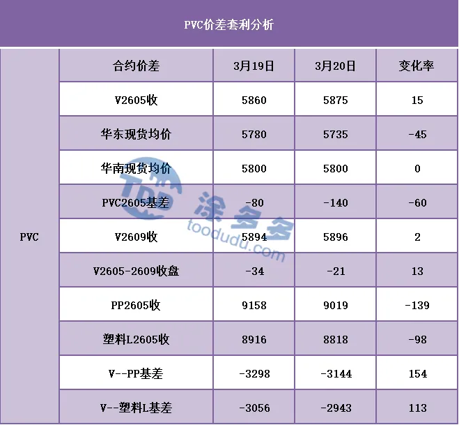 期货方面:PVC2605合约期货盘面期价的运行对比昨天幅度有所收窄,高点也有所下移,本周内的期价的调整基本在高位,周四出现最高点6084,技术层面显示布林带(13、13、2)三轨开口向上仍旧维持向上的态势,日线级别的KD线两线交叉,MACD线继续呈现金叉趋势,但金叉缩小。单从技术层面来看,高位横盘的行情或面临一定的运行压力。近期主力05合约的持仓一直在下降,一方面资金规避大幅行情的风险,另一方面调整宽幅的情况下散户也有离场。我们仍旧维持前期的观点,短期之内期价的运行观察5750-6100区间的调整。现货方面:有中东战事引发的行情仍在延续,近期周内国内新闻以及政策较少,甚至包括消息层面均为有明显的因素出现。在大行情变动的情况下,PVC产业链的上、中、下游角色也在发生改变,目前的出厂价格报盘仍旧相对强势,多数企业反馈目前出货顺畅,甚至出现排队装货的现象,签单以及提货积极性较高。但中间商方面在大行情中,延续前期的点价套保思路,而在行情多变的情况下未能及时转变策略,造成部分利润的损失。原油方面国际油价涨跌互现,因伊朗袭击了中东地区的多个能源设施,导致交易剧烈波动,而在美国总统着眼于11月中期选举之际,美国政府采取措施增加石油供应。整体来看短期之内PVC价格或继续偏强调整为主。 据涂多多数据测算,3月20日国内电石法PVC现货指数为5703.46,跌21.32,幅度0.372%。乙烯法PVC现货指数为6449.35,跌39.35,幅度0.606%,电石法指数下跌,乙烯法指数下跌,乙烯法-电石法指数价差745.89。来源 | 涂多多产业大数据部
