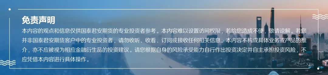 根据《证券期货投资者适当性管理办法》,本报告发布的观点和信息仅供国泰君安期货的专业投资者参考。若您并非国泰君安期货客户中的专业投资者,为控制投资风险,请取消订阅、接收或使用本报告中的任何信息。本报告难以设置访问权限,若给您造成不便,敬请谅解。请您根据自身的风险承受能力自行作出投资决定并自主承担投资风险。