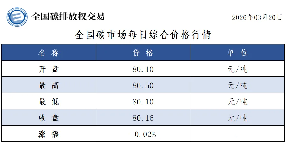 2026年1月1日至3月20日,全国碳市场碳排放配额成交量18,728,482吨,成交额1,404,774,601.50元。