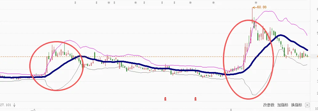 尤其是当股价长期在一个狭窄区间横盘整理,布林带宽度收得特别窄,成交量也极度萎缩之后。突然某天出现一根放量阳线,股价冲出上轨,同时上下轨迅速张开,这就跟弹簧压到极致突然弹开是一个道理。