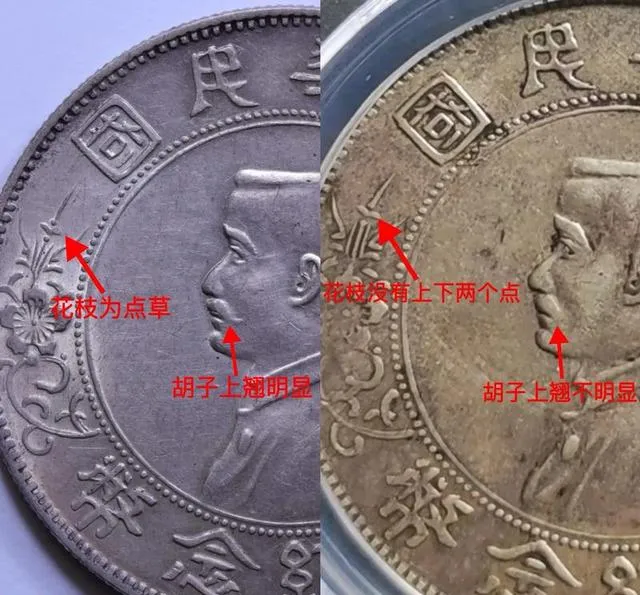 这两枚放在一起,左真右假,光看外形仿得也像那么回事,不过细节一扒拉就分出高下,左边花枝上有点草,胡子上翘明显,右头这枚胡子跟花枝都软塌塌的,没那股精气神,懂行人抓一眼就能认出来,市场价差十万八千里,老钱币收藏“差毫厘失千金”,不少新手吃了亏才懂得这句,我妈原来还说:“别啥老东西都揣兜,没那金刚钻多了是糟心。”
